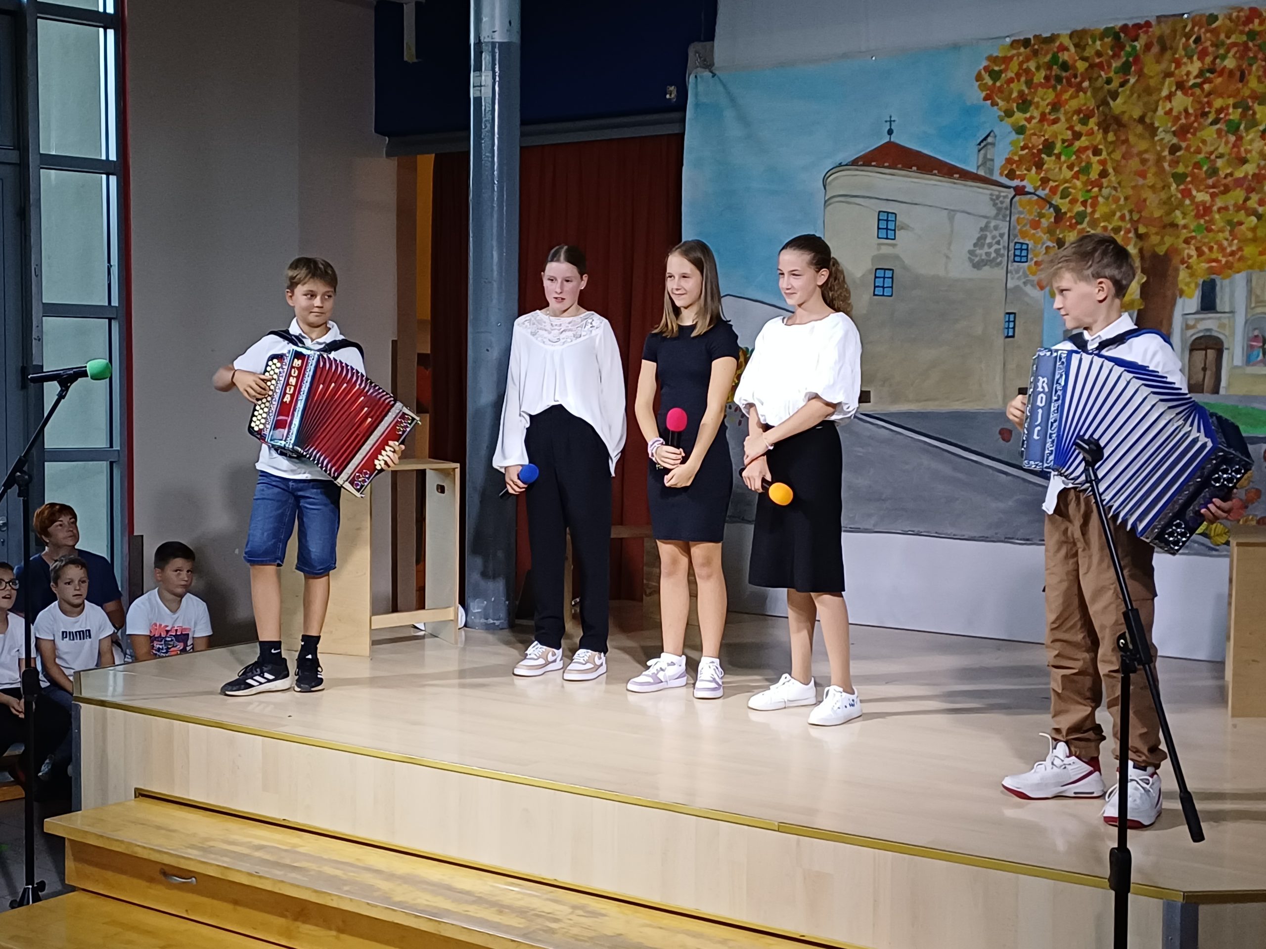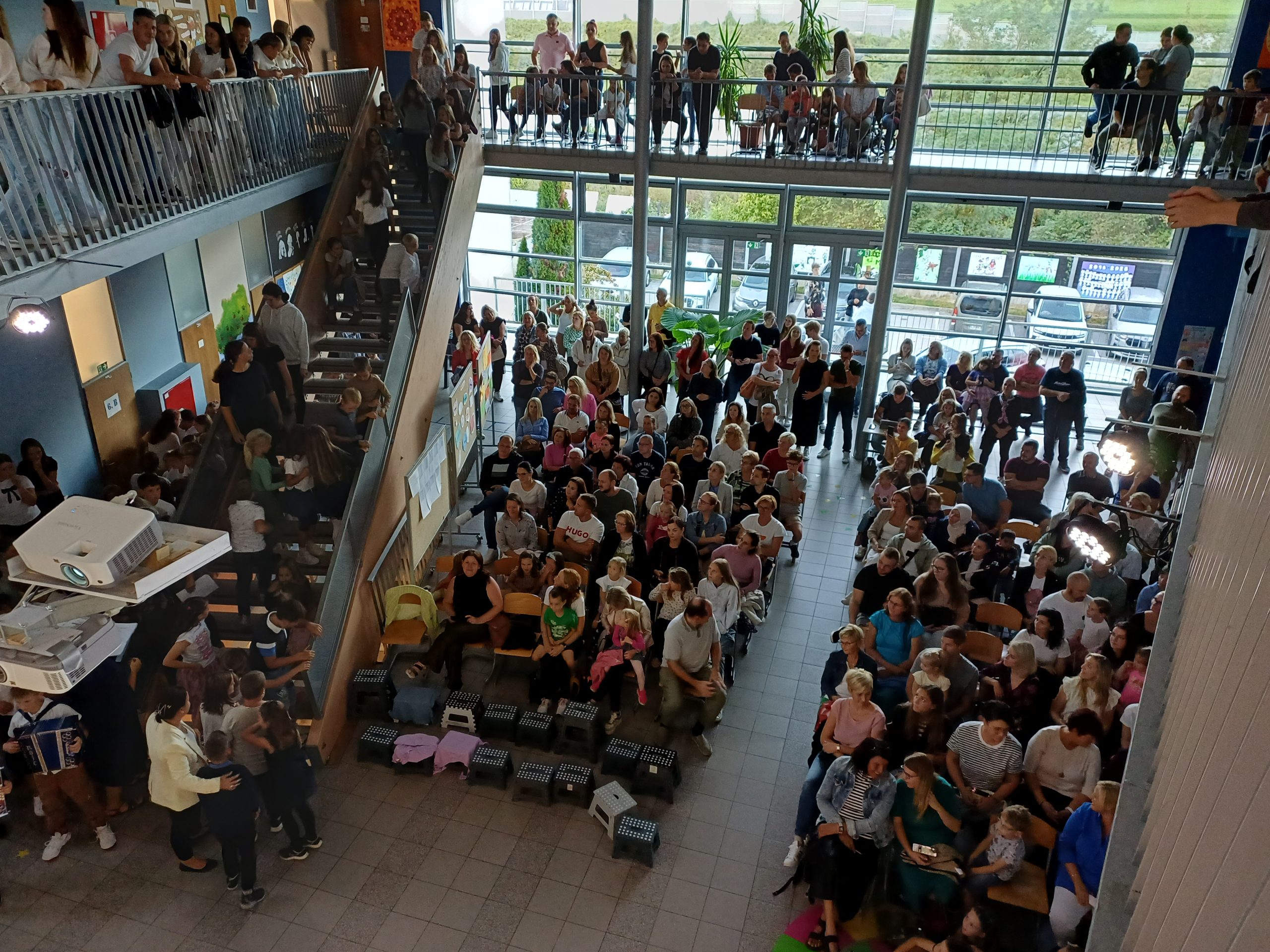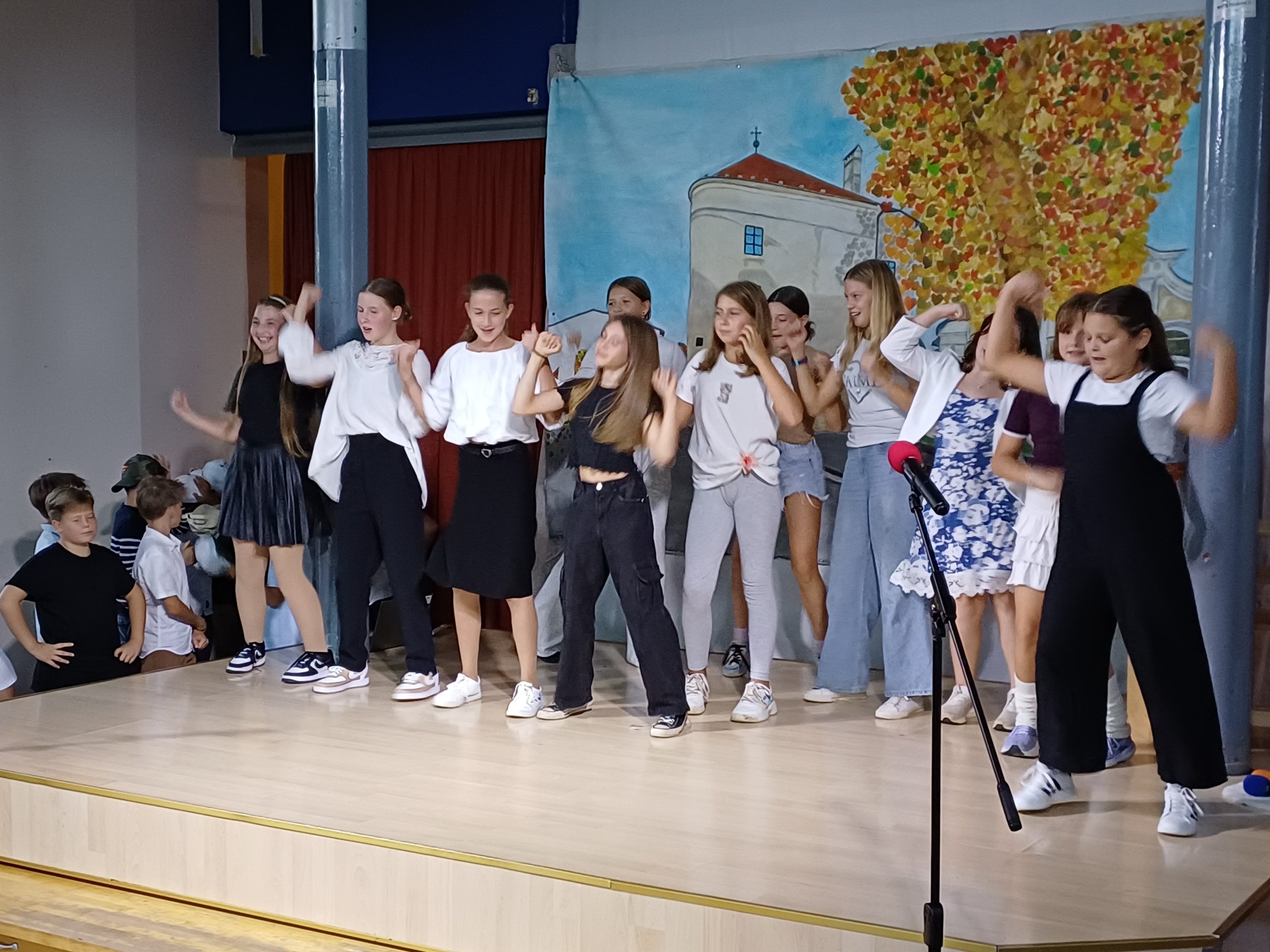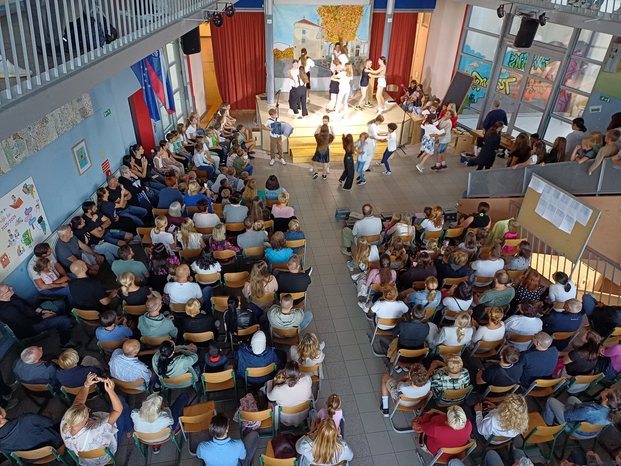 Zavedamo se namreč različnih situacij v svetu, ki pa jih ljudje lahko za hip izpustimo iz misli, kadar smo združeni v pesmi in seveda tudi v plesu, kar smo pričarali naši publiki v približno eni šolski uri. Naši učenci so ubrano peli v angleščini, španščini, italijanščini, hrvaščini, recitirali v našem maternem jeziku ter prikazali venček plesov iz različnih jezikovnih okolij.