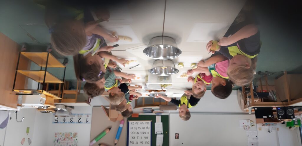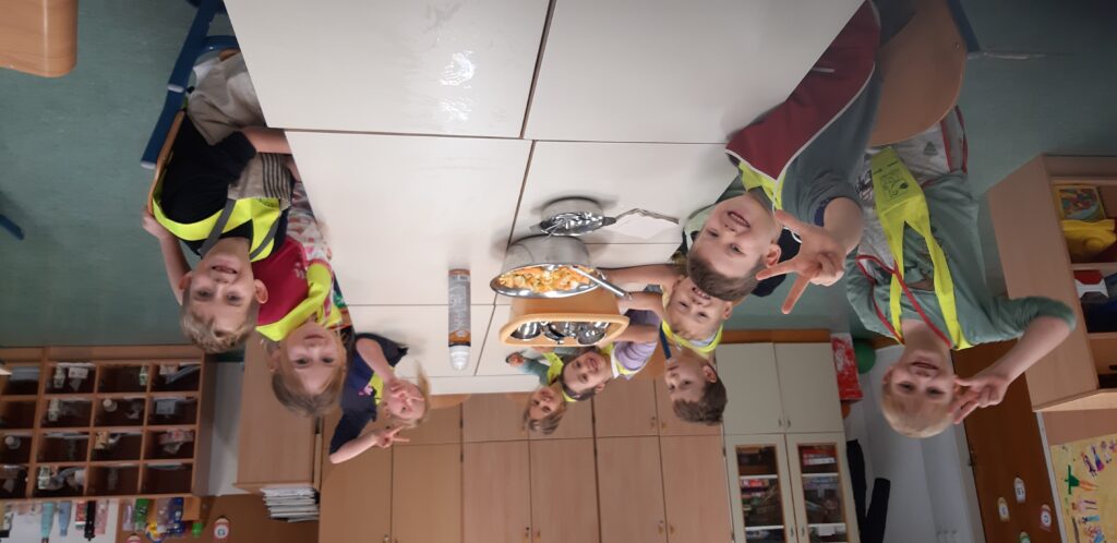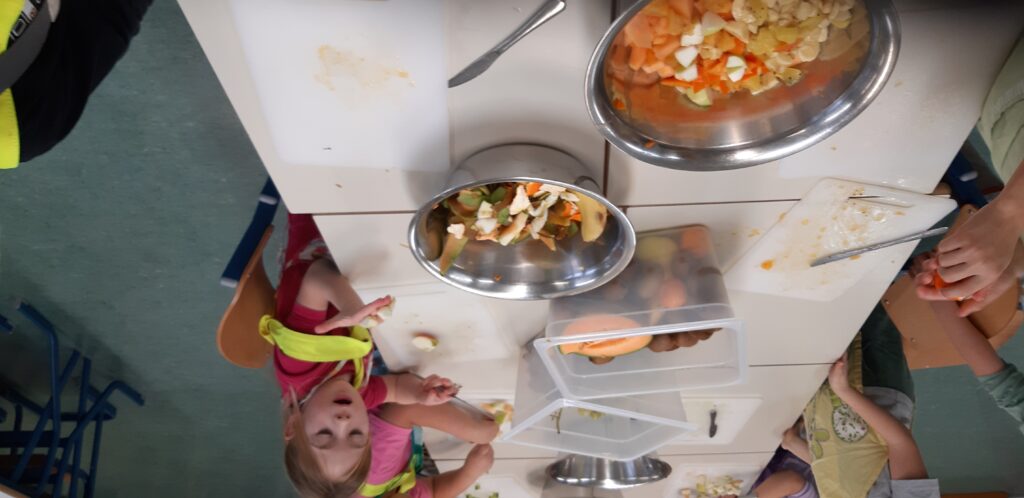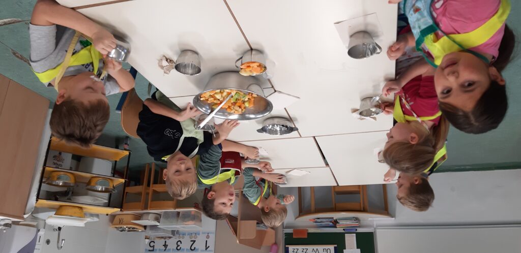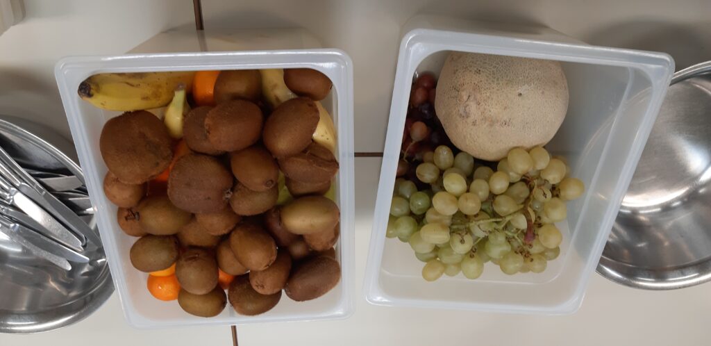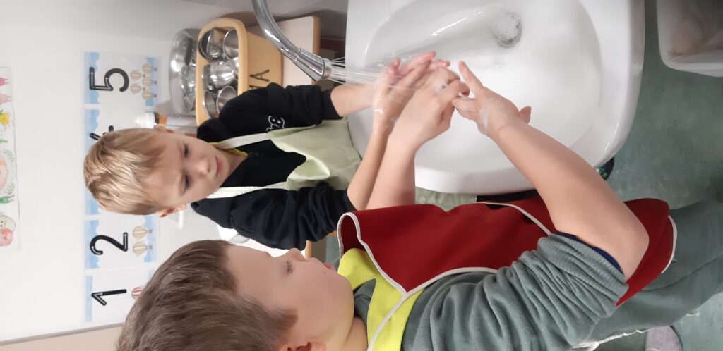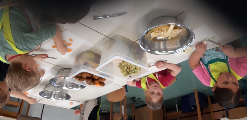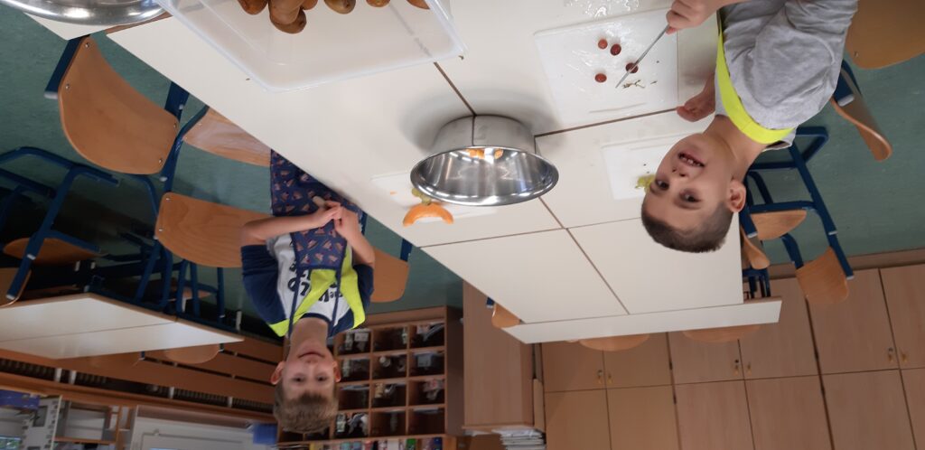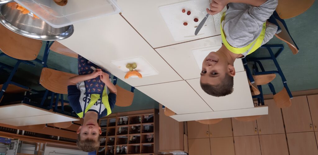 Najprej smo si nadeli predpasnike, ki smo jih prinesli od doma, in si temeljito umili roke. Oprano sadje, ki nam ga je pripravila naša kuharica, smo poimenovali in se pogovorili o njem. Nato smo si razdelili kuhinjske pripomočke – deske, nože in sklede.