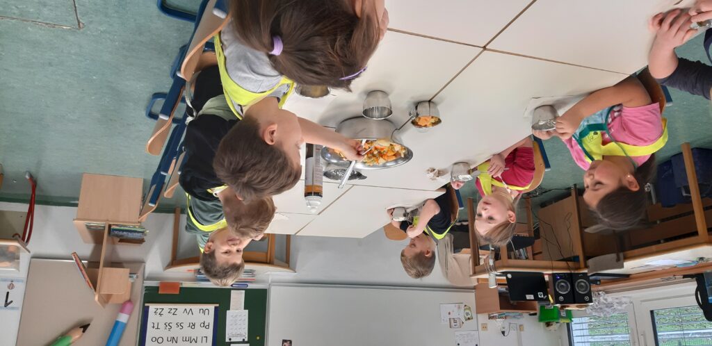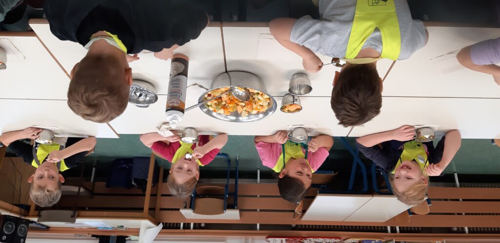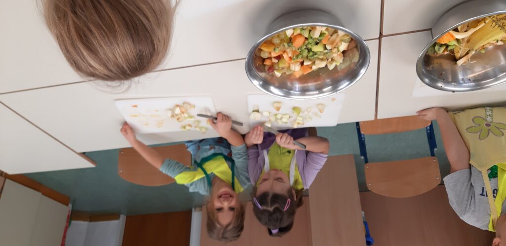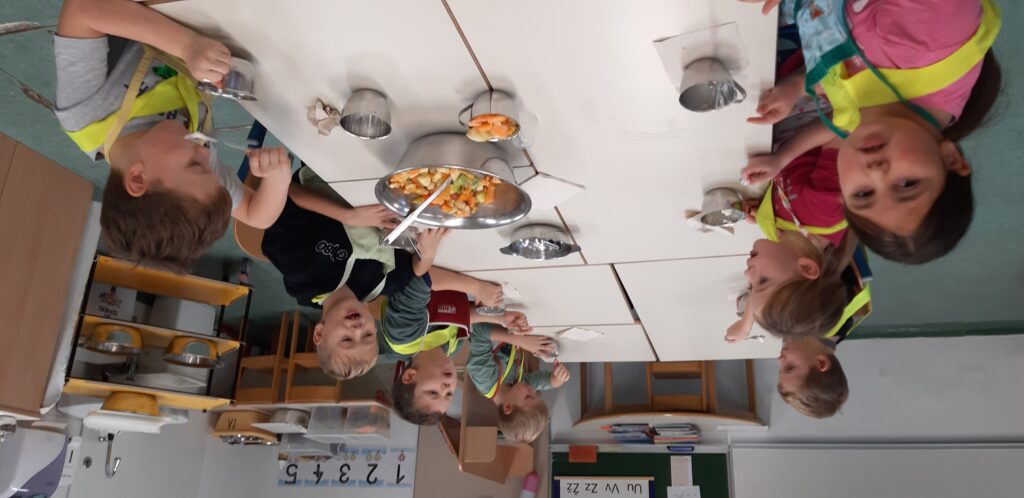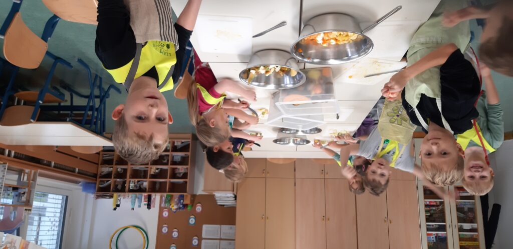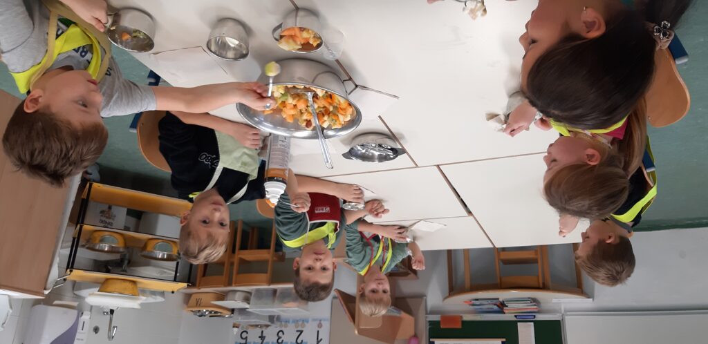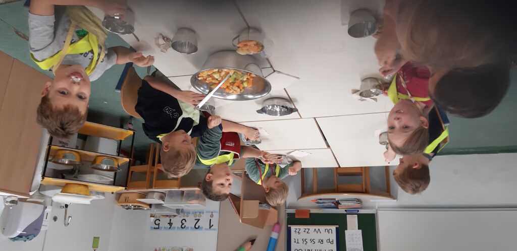 V petek, 3. 12. 2025, smo prvošolci 1. a in 1. b razreda pri RAP dejavnosti »Gospa kuhla« pripravili okusno sadno solato.